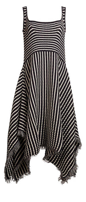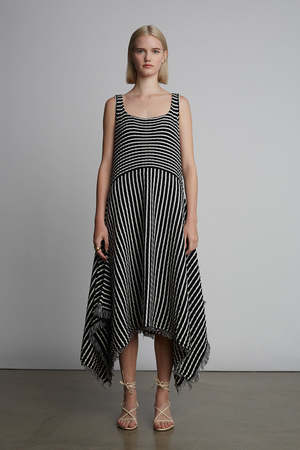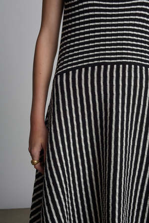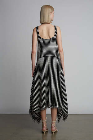 *PRE ORDER | APPROXIMATE SHIP DATE | MARCH 1* Ramona is a striking, square-neck, tank dress with a handkerchief fray-fringe hem that is dressy and dramatic. The dress is made in a wide flat rib stitch with plaited elastane for recovery in a classic black and ivory stripe. Dress Ramona up or down, perfect for an occasion or to be worn more casually depending on your shoe and jewelry pairing. DETAIL: - Sustainably made in Peru with LOVE - Made from Peruvian yarn: 95% cotton, 5% elastane - Striped wide rib stitch with plaited elastane in the tank top only - Fray-fringe detail at armhole and bottom hem in self-yarn - Dry clean only, or hand wash cool, dry flat, no tumble SIZING: - Body length ends at low calf - Body width at chest|waist|bottom hem: approximately 11 - Model is wearing size: XS/S - Model is size S, size 2 and 5ft 10 in height - Measurements are based on size S and taken on the flat.