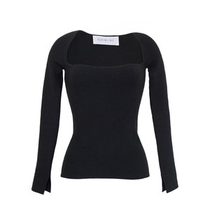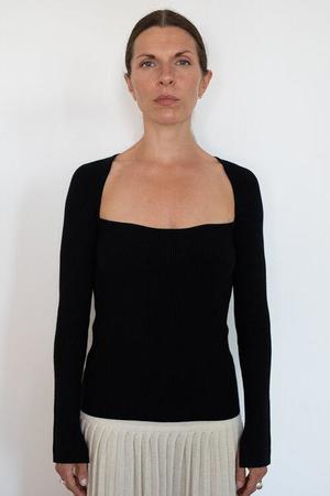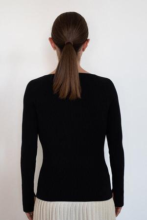 Elle is a feminine, bandeaux with halter shape, neck sweater in essential black. The sweater has a skinny rib stitch looks great tucked in if desired to be relaxed-dressy for whatever occasion day or night occasion. DETAIL: - Sustainably made in China at a small family-owned factory - Made sustainably from local yarn: Cotton, nylon, elastane, cashmere blend - Light weight, rib stitch on a skinny body plaited with nylon elastane to keep good rib recovery - Bandeaux Halter neck trim shape - Split detail at interior cuff seam - Dry clean only SIZING: - Body length (top shoulder to bottom): approximately 23" - Body width at chest|waist: approximately 12 1/2 (Note: rib naturally expands when worn) - Model is wearing size: S - Model is size S, size 2 and 5ft 10 in height - Measurements are based on size S and taken on the flat