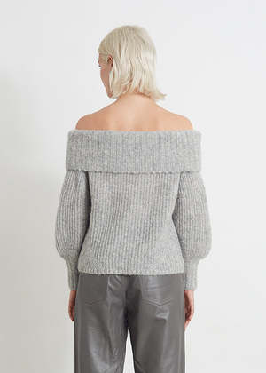 PRE-ORDER | SHIPPING WEEK OF NOV 14TH, 2022 Lilia is an off shoulder cozy sweater that is dressy yet relaxed in timeless pale grey melange. The sweater is made in a classic fisherman rib, with a bold ribbed turn-back, neck-trim and feminine blouson sleeves. Lilia is a perfect for holiday-dressing needs when you want to be effortlessly sleek yet cozy! DETAIL: - Sustainably made in Peru with LOVE - Made from Peruvian yarn: 89% baby alpaca, 11% polyamide - Fisherman rib stitch - Feminine off shoulder neck line with deep-ribbed, bend-back neck trim - Blouson sleeves with skinny rib cuffs - Dry clean only SIZING: - Body length (top shoulder to bottom): approximately 18" - Body width at chest: approximately 17 - Body width at bottom hem: approximately 16 1/2 - Model is wearing size: XS/S - Model is size S, size 2 and 5ft 10 in height - Measurements are based on size XS/S and taken on the flat