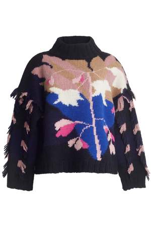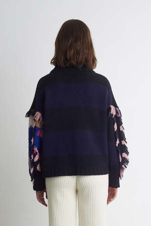 The Bailey sweater is a collaboration with local Hudson-valley artist: Gemma Bailey. The graphic, intarsia-technique, is a translation of one of the artists bold, abstract floral artworks with a textural multi-color short fringe tape applied to the sleeves. The Bailey has a relaxed, body-silhouette, has-side-splits and straight sleeves. The sweater is anchored with wide-rib trims at the mock-neck and cuffs. The piece is ethically made from the softest, Peruvian alpaca yarn to be a wearable art, statement piece that you can cocoon in. DETAIL: - Ethically made in Peru by artisans with LOVE - Made sustainably from Peruvian alpaca blend yarn - Graphic, intarsia pattern is part of an artist collaboration with Gemma Bailey - Multi-color short fringe tape detailed applied to sleeves - Chunky rib trims at double mock-neck and wide, single rib at cuffs and bottom hem - Splits at bottom hem for movement - Dry clean only SIZING: - Body length (top to bottom): approximately 21 - Body width at chest | waist | bottom hem: approximately 22 - Model is wearing size XS/S - Model is size XS/S, size 2 and 5ft 10 in height - Measurements are taken on the flat