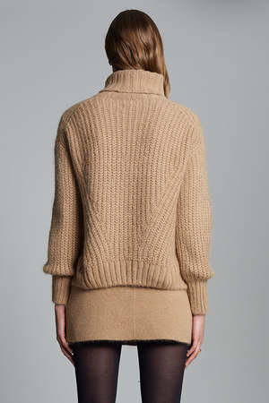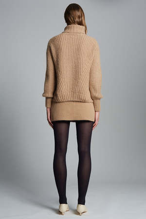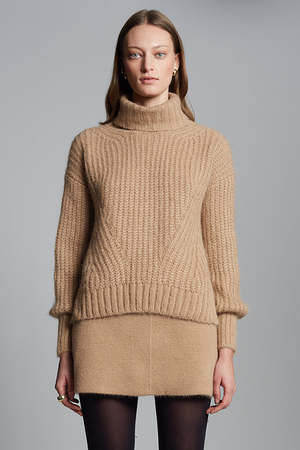 Ali is a relaxed turtleneck sweater with feminine blouson sleeves, crafted from the softest brushed alpaca-blend yarn. The sumptuous, signature fisherman-stitch body and sleeves contrast with the chunky wide-ribbed turtleneck. Ali is extremely light and lofty, perfect for styling in a relaxed or polished way. Knit in Peru by artisan women. Made sustainably from Peruvian yarn: 89% baby alpaca, 11% polyamide. Fisherman rib stitch with engineered fully fashioning. Easy body and sleeve with dropped shoulder armhole. Rib trims at fold-back turtleneck and cuffs. Dry clean only. Body length (top to bottom): approximately 20 1/2". Body width at chest/waist/bottom hem: approximately 19 for relaxed fit. Model is wearing: Size XS/S. Measurements are based on size XS/S and taken on the flat.