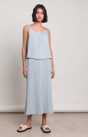 Valeria cami tank is an elegant, yet versatile, pop-on-and-go piece. The subtle, light-weight of the pima-cotton pleats give beautiful fluidity of movement. Valeria can be worn as a knit-dressing set by pairing back to the Violet Skirt for head-to-toe tonal dressing, or effortlessly styled with your favorite high-waisted pants. DETAIL: - Made in Peru with LOVE - Made from 100% Peruvian mercerized cotton - Light-weight pleat stitch that has fluidity - Adjustable spaghetti straps to be tied at shoulder - Wide, swing bottom hem - Dry clean only SIZING: - Body length approximately 18 (once straps tied however body length is adjustable depending on length of strap - Body width at chest: approximately 18 and bottom hem is wide when pleats open - Model is wearing size: XS/S - Model is size S, size 2 and 5ft 10 in height