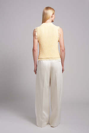 Bria is an elevated mock-neck sweater-tank designed to be layered or worn alone as an outfit staple. The cotton wide-rib stitch and fray-fringe detail at the armhole and bottom hem give this piece an effortless, feminine feel. Bria fits slim with ease and has a slightly cropped body proportion that styles beautifully with high-waist pants. DETAILS: - Made in Peru with love - Sustainably made from 100% Peruvian cotton - Transitional, wide rib stitch - Mock neck with double rib trim detail - Flattering fully fashioned cable detail at bust - Fray-fringe detail at armhole and bottom hem SIZING: - Body length (shoulder to hem): Approximately 17 1/2" - Body width (chest/waist): Approximately 16" - Model is wearing size S - Model is size S, Size 2 and 5ft 10" in height