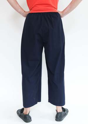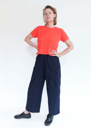 Elastic waist pant with in-seam detail pockets. 60% lyocell, 40% cotton. Machine wash cold, tumble dry low. Made in USA.