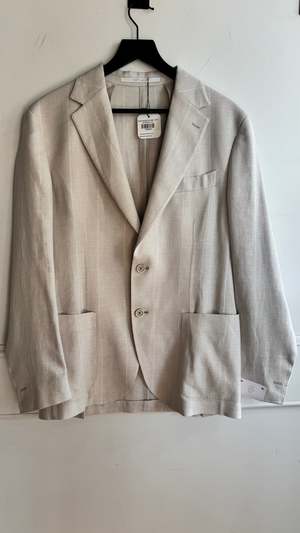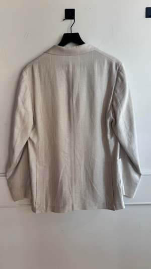 Single-breasted blazer with a woven construction, lapel collar, long sleeves, partially lined interior, button fastenings, multiple pockets, and dual back vents. Hand wash, do not bleach, do not tumble dry. Made in Italy. 90% Linen, 10% Polyester.