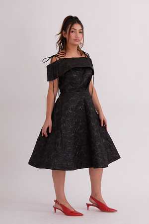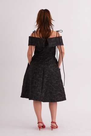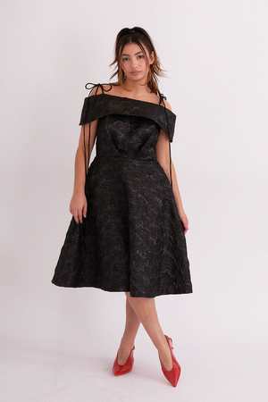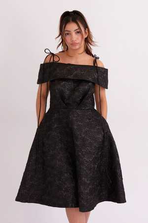 With a full A-line shaped skirt and off-shoulder bandeau, the Amoura dress features our classic V-shape pleat and adjustable tie straps. The full skirt has pockets and is fully lined. - Off-shoulder a-line dress with adjustable ties - Invisible zipper at the back - 100% Polyester - Dry-clean only - Made in Canada - Katicha is 5'5 and wearing a size S