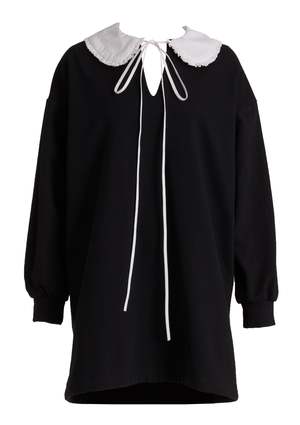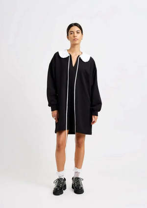 The Darcy Sweater Dress is made from a partially recycled cotton terry that provides the perfect balance of comfort and softness with its oversized silhouette. The white frilly collar and extra long ties give this black sweater dress a whimsical touch that will keep you feeling snug and relaxed. Not to mention, deep pockets to keep your hands (and phone) warm! - 70% Cotton. 30% Recycled Cotton - Slips on over head - Oversized fit - Has pockets - Machine washable Made in Canada.