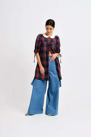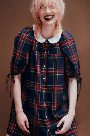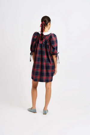 Crafted from classic navy blue plaid, this timeless schoolgirl-inspired dress features a dainty Peter Pan collar, elegant puff sleeves, and can be dressed up further with jeans or simply be worn alone for an effortless look. The Evelyn Poplin Dress is the versatile wardrobe staple every girlie needs! - 65% Polyester, 35% Rayon - Flower shaped buttons down the front - Has pockets - Machine wash cold, hang to dry - Made in Canada Sustainability slowly and ethically made in small batches in Montreal, Canada