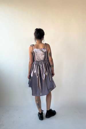 Introducing our Amy dress in shimmery metallic. Amy is versatile and easy-to-wear, this A-line mini dress features a fully gathered skirt and adjustable spaghetti strap ties for a perfect fit. It has deep side pockets, to put your hands, or your keys! - Lilac metallic - Fully lined - 100% polyester - Slips on over head and has adjustable tie straps - Dry clean only - Made in Canada