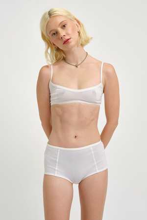 This high waist white mesh panty features dainty picot edge trim elastic and is made from a sturdy and robust power mesh. Lined with cotton for ultimate comfort and made in Montreal, this panty pairs perfectly with the Ruby bralette and was designed to fit nicely underneath our Bella, Delia, and Gigi tops. - Machine wash cold and hang to dry - 80% Nylon, 20% Spandex - Made in Canada