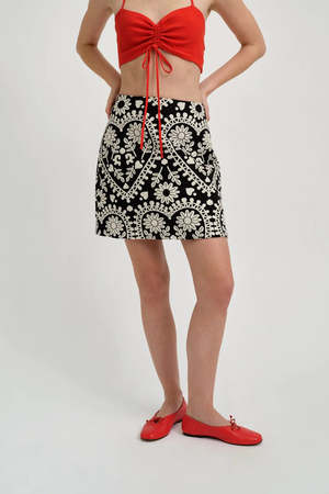 Introducing the Tara Skirt - a bold, black and white A-line mini skirt made from high-quality french jacquard. - 65% Cotton, 31% Polyester, 4% others - Invisible zipper at the back - Wash in cool water and lay flat to dry - Made in Canada Sustainability made slowly and in small batches in Montreal, Canada. Sizing info Size - Waist - Hip - Length (Waist - Hem) XS: 24, 38, 16.5 S: 26, 40, 16.5 M: 28, 42, 16.5 L: 30, 44, 16.5 XL: 32, 46, 16.5 XXL: 34, 48, 16.5