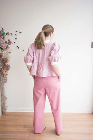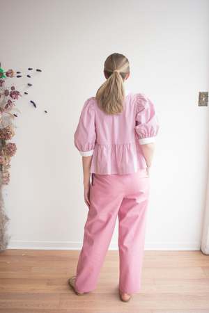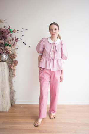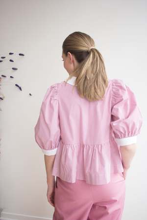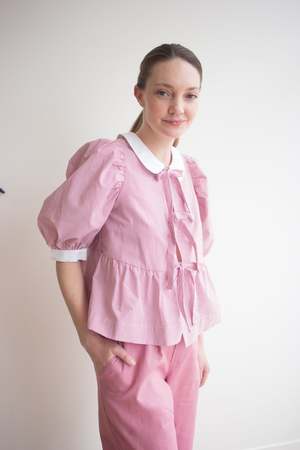 The Georgie Blouse by Eliza Faulkner features a dainty peter pan collar, sweet puffy sleeves, and adjustable ties at the front. Wear it on its own or pair it with the matching Bauer shorts in the same fabric for a playful summer set! Sizing Notes: This top fits true to size, it's made with volume and ties up at the front. We recommend ordering your usual size to achieve the look on the model. Please see below for exact garment measurements. Flat measurements in inches are as follows: Size - Bust - Waist - Hip - Length - Shoulder XS: 35 - 37 - 52 - 22 - 3 S: 37 - 39 - 54 - 22 - 3 M: 39 - 41 - 56 - 22 - 3 L: 41 - 43 - 58 - 22 - 3 XL: 43 - 45 - 60 - 23 - 3 XXL: 45 - 47 - 62 - 23 - 3 60% Cotton, 40% Polyester Wash cold, hang to dry Made in Montreal, QC