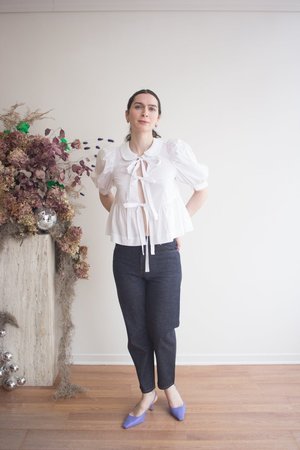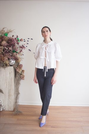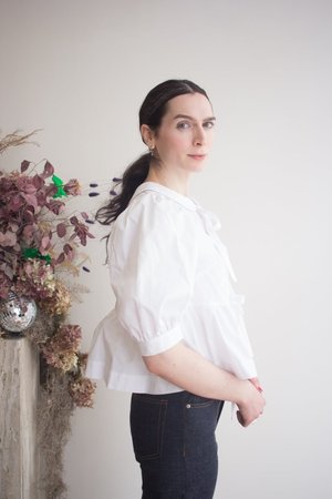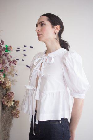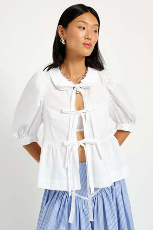 The Georgie Blouse by Eliza Faulkner features a dainty peter pan collar, sweet puffy sleeves, and adjustable ties at the front. Wear it on its own or pair it with the matching Bauer shorts in the same fabric for a playful summer set! Sizing Notes: Bobbie wears size small. This top fits true to size, it's made with volume and ties up at the front. We recommend ordering your usual size to achieve the look on the model. Flat measurements in inches are as follows: Size - Bust - Waist - Hip - Length - Shoulder XS: 35 - 37 - 52 - 22 - 3 S: 37 - 39 - 54 - 22 - 3 M: 39 - 41 - 56 - 22 - 3 L: 41 - 43 - 58 - 22 - 3 XL: 43 - 45 - 60 - 23 - 3 XXL: 45 - 47 - 62 - 23 - 3 100% Cotton Wash cold, hang to dry Made in Montreal, QC.
