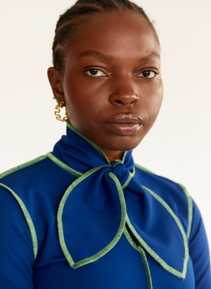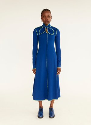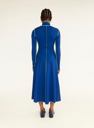 Eliza Faulkner's Pippa Dress is a midi-length, long-sleeved dress that is fitted through the bust and waist and flares out into a dramatic A-line skirt. Made with a thick blue ponte fabric and contrast top-stitching, this fabric is not clingy or light but is actually thick and stretchy, giving you that 'hugged-in' feeling. There's a peep-hole and bow tie to the neck so that its easy to slip on over your head and tie as you wish. Pair it with chunky boots and you're good to go! Garment Measurements: - XS - Bust 30, Waist 26, Hip 36 - S - Bust 31, Waist 28, Hip 38 - M - Bust 32, Waist 30, Hip 40 - L - Bust 34, Waist 32, Hip 42 - XL - Bust 35, Waist 32, Hip 42 - XXL - Bust 37, Waist 35, Hip 44 Length of the dress from shoulder to hem is 50" for all sizes 65% Rayon, 30% Nylon, 5% Elastane Fabric has stretch to it Wash cold, hang to dry Also available in Black & White and Black & Multicolour Made in Montreal When you shop at Victoire Boutique you're supporting independent Canadian designers from across the country. Eliza Faulkner sources fabrics woven in Montreal and uses deadstock fabrics whenever possible! She is always seeking for new ways to design and create sustainably and ethically. After finishing her degree at Central St. Martins in London, she sewed her first dresses in her cabin home. Since those early days, she has gained recognition across North America for her clean lines, feminine silhouettes, and playful, relaxed attitude towards dressing.
