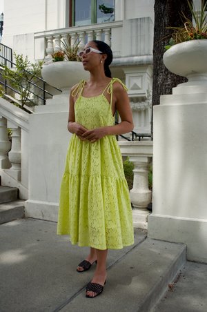 Chartreuse cotton eyelet is very rich in its color and texture. The Cece has two gathered tiers that suspend from delicate spaghetti straps. It's fully lined with a cotton blend lining and of course, it has pockets. Slips over head, with adjustable tie straps. 100% Cotton eyelet Made in Montreal, Canada