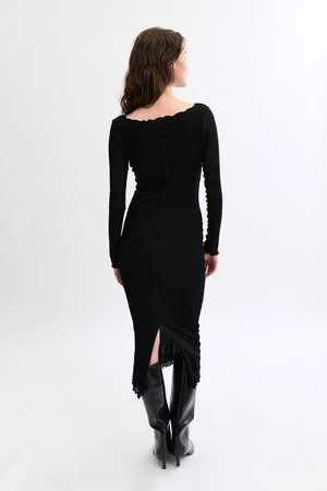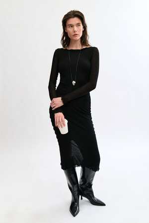 Sewn from the same soft, slightly sheer fabric as our micro knits, but double-lined for extra coverage. Meet Riley! A relaxed long-sleeve midi length dress with a boat neckline, effortlessly easy to wear dressed up or down. Made slowly in Montreal, Canada. MATERIALS & CARE 70% Lyocell, 30% wool Wash in cold water (delicate cycle if possible) and lay flat to dry SIZE & FIT XS - Length: 50.5", Waist: 23", Bust: 26" S - Length: 50.5", Waist: 25", Bust: 28" M - Length: 50.5", Waist: 26", Bust: 30" L - Length: 50.5", Waist: 27", Bust: 31" XL - Length: 50.5", Waist: 30", Bust: 33
