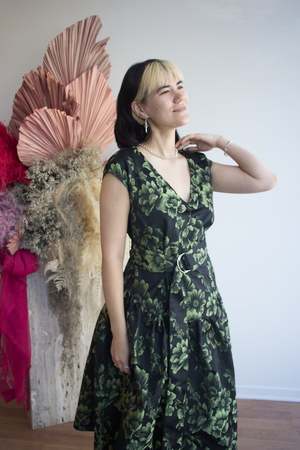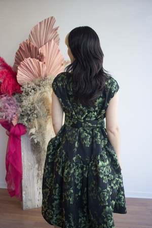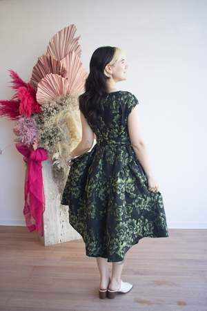 The Betty Dress by Eliza Faulkner is a modern, elegant midi A-line dress with a vintage feel. It features a V-neckline, hidden side slit pockets, a basque waist, and a removable adjustable sash belt. The green floral jacquard fabric shines in the light as you move. This dress is perfect for weddings or formal events. Size Notes: Fits true to size; we recommend choosing your true bust size for the perfect fit. Please see below for flat measurements. Yolande and Amber are both wearing size S. 100% Polyester Jacquard Made in Montreal.
