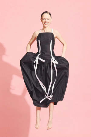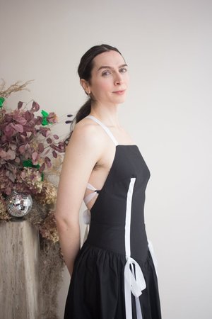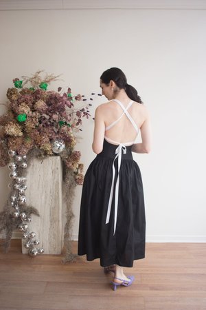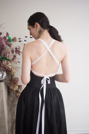 Eliza Faulkner's new Gwen Dress is here! Made from soft, high-quality cotton, this ankle-length dress features a flattering basque waistline, a thick ribbon bow at the front, and a stunning open back with crossed adjustable ties. This dress is fitted and body-hugging but has stretch. Flat measurements in inches are as follows: Size - Bust - Waist - Hip - Length XS: 27 - 23.5 - 31 - 34.5 S: 29 - 25.5 - 33 - 35 M: 31 - 27.5 - 35 - 35.5 L: 33 - 29.5 - 37 - 36 XL: 35 - 31.5 - 34 - 36.5 XXL: 37 - 33.5 - 41 - 37. 100% Cotton. Wash in cool water, hang to dry. Made in Montreal, QC.