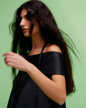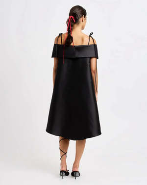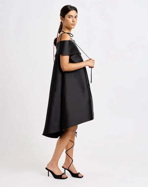 The Cora Trapeze Dress is an exquisite piece inspired by French couturiers. Delicate spaghetti ties, an off-shoulder band, and Italian mikado fabric give this dress a timeless quality, while its trapeze silhouette ensures comfort and whimsy. - 100% Polyester - Ties at the shoulder and invisible zipper at the side - Oversized fit through the body; the main fit point is around the shoulders - Has pockets - Dry clean only - Made in Canada