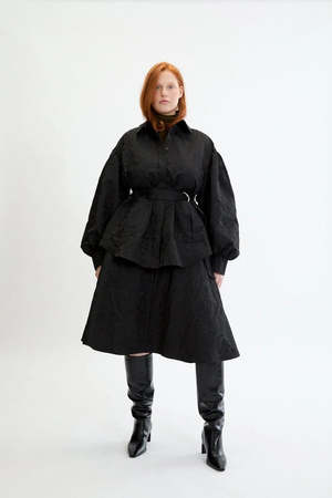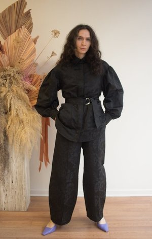 The Laurence Jacket by Eliza Faulkner is crafted from a beautiful black floral fabric and features oversized sleeves, front patch pockets, and a removable waist belt. Its classic oversized silhouette offers adjustability for a personalized fit. Pair with the Yves Pant for a monochromatic look or wear as a statement jacket. Sizing Notes: This jacket fits true to size and is made a little oversized. The belt is removable and adjustable to create your perfect fit. We recommend your usual size. Please see exact garment measurements below for fit guidance. Size XS - Length: 30", Waist: 36", Bust: 33" Size S - Length: 30.5", Waist: 40", Bust: 34" Size M - Length: 31", Waist: 44", Bust: 35" Size L - Length: 31", Waist: 47", Bust: 36" Size XL - Length: 31.5", Waist: 48", Bust: 38" Size XXL - Length: 31.5", Waist: 51", Bust: 39" 100% Polyester Wash cold, hang to dry, do not bleach, do not tumble dry. Made in Montreal.