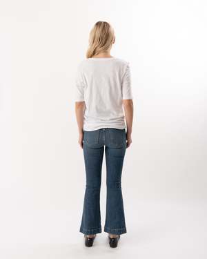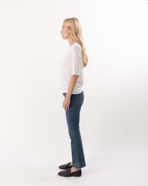 Elevate your casual wardrobe with this cinched short sleeve white tee. Featuring a flattering gathered detail at the waist, it offers a modern silhouette that enhances your natural shape. Crafted from soft, breathable fabric, this tee ensures all-day comfort while adding a sleek, stylish touch to any outfit. Perfect for pairing with jeans or skirts for a chic, effortless look.