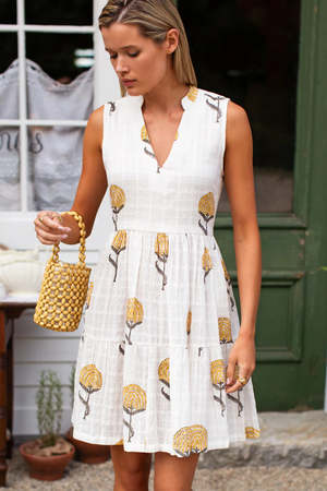 An easy, above-the-knee length sundress featuring a playful tiered skirt, V-neckline with stand collar, and side seam ties at the waist for an adjustable fit. Sleeveless silhouette is comfortably bra friendly and fully lined for opacity. Plus, it has pockets. Crafted from a hand-block printed cotton with a woven windowpane texture. Designed in New Hampshire and produced in partnership with family artisans in Rajasthan, India. Ethically made in India. 100% Cotton. XS/S: Bust 36 1/4" | Waist 37 1/2" | Length 36 3/4" M/L: Bust 39 1/4" | Waist 40 1/2" | Length 37 1/4".