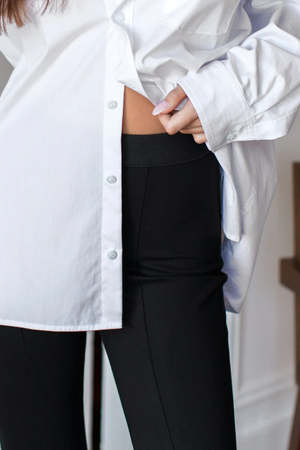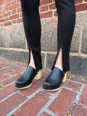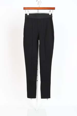 EF Signature ponte knit with an elastic waistband provides nice compression and weight to the fabric. Features a hidden zipper at the front of the ankle, seams down the center front and back, full length, and a tapered fit. Model is wearing a size small. Made in NYC.