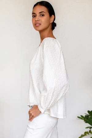 This style is slightly sheer and features a more pronounced Swiss dot stripe texture than in photos. Details: 100% organic cotton Swiss dot stripe Shirred, bound scoop neckline Button front Blouson style, full sleeves with button cuff Straight hem Lined Easy, breezy fit Model is a size XS/S and wearing a size Small for a more oversized/relaxed fit Hand wash cool, gentle, and line dry Made in Rajasthan, India Sizing: XS: Bust 42", Sweep 48", Sleeve 14", Length 24" S: Bust 44", Sweep 50", Sleeve 14.5", Length 24.5" M: Bust 46", Sweep 52", Sleeve 15", Length 25" L: Bust 48", Sweep 54", Sleeve 15.5", Length 25.5"