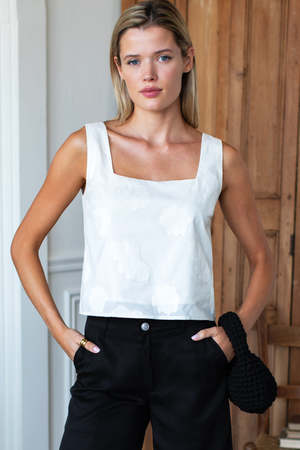 Simple and sweet, this boxy cropped top features a square neckline that pairs perfectly with your favorite jeans or trousers. Made from a beautiful ivory floral print jacquard. - 100% Cotton - Lined - Runs slightly big, if in doubt, size down.
