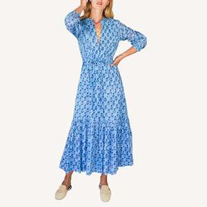 Our go-to drawstring waist dress in an updated fit, now with a placket for more coverage behind the bust, button closure, and a relaxed fit through the hips. Organic cotton. Details: - Hand block printed with low impact dye - Easy, breezy fit - Set-in sleeve with gathers at shoulder and a little puff - Lined - Button closures on bodice - Modesty placket under buttons - Mandarin-style collar - Set-in sleeve with little puff shoulder - Drawstring waist - Button closure at cuff - Tiered ruffle hem Model is 5'9" and wearing size small. Made in Rajasthan, India. Hand wash cold, gentle, and air dry. Sizing: XS: Bust 35", Hip 48", Length 52.5" S: Bust 37", Hip 50", Length 53" M: Bust 39", Hip 52", Length 53.5" L: Bust 41.5", Hip 54.5", Length 54"