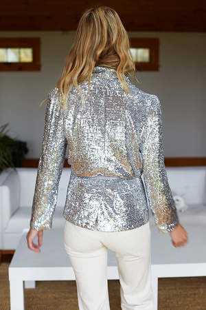 - Custom EF complex silver sequin - Lined - Removable waist sash - Shawl style collar - Set in 1930s puff shoulder - If between sizes, size up - Model is 5'9.5" and wearing a size small - Model measurements: Bust 33", Waist 26", Hip 36", Cross Shoulder 16.5" - Dry Clean only - Made in NYC