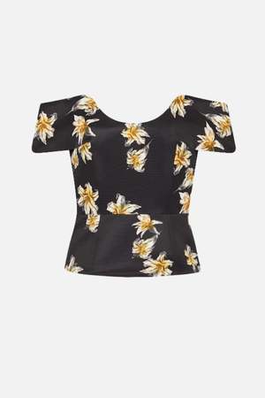 The Souline Top in black and yellow Festive Lilies Taffeta Faille is a statement piece for refined occasion dressing. Designed with an off-the-shoulder neckline and structured fit, it highlights the waist with an asymmetric peplum hem. Crafted in a lightweight taffeta faille, the floral print brings a sophisticated touch to the silhouette. Style with tailored trousers or a pencil skirt for a polished evening look.