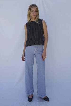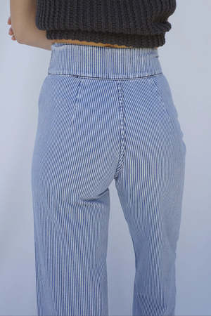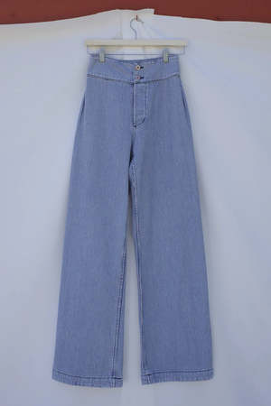 The Picnic Pant is a washed railroad denim pant from Emma Rothkopf made from 100% cotton, perfect for summer. It features a high waist, two exposed copper shank buttons, a hidden button fly, and a seamless silhouette. Inspired by vintage Navy sailor pants, these pair easily with blouses, tees, or cropped tops. DETAILS + FIT - 100% cotton denim - Fits true to size - Made in the USA