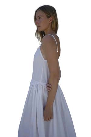 The Ritual Dress is a tank-style dress with a gathered full skirt and lace trim at the neckline. Made from washed cotton poplin, it has a simple bodice and a flowing skirt that adds movement. Straps are adjustable.