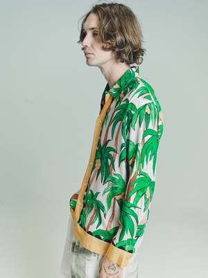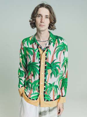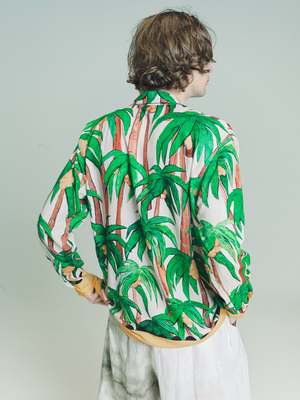 Distorted and exaggerated palm trees are painted in an expressionist style with rough brushwork and a primitivist composition. These tropical palm trees are angular by nature, expressive and slightly wonky; some are fruiting yellow coconuts and the trees appear to be sloping down as if their green fronds are weathering a storm. As dream symbols, palm trees symbolise our ability to rise above conflict and spread our light brilliantly letting it shine over the din of petty concerns rising above disillusionment like the sun itself. Palms in dreams may also be a message for us to resurrect aspects of ourselves. In resurrecting these parts, we become a more whole entity. Features include; Ecru / Multi Eco Vero Fabric, Original Artwork, Playful, Unique Yellow Border, Camp Collar, Long Sleeves, Straight Hem, Mother of Pearl Buttons, 100% Eco Vero Ethically Produced by Lenzing. Limited Edition of 100. Made in Bali, Indonesia. For Every Item Sold Endless Joy Plants 3 Trees. Viscose Model wears Size M