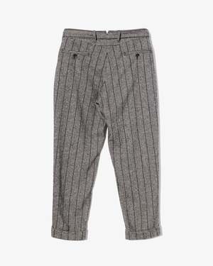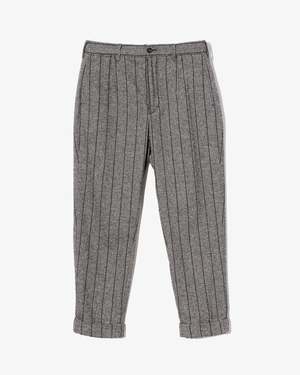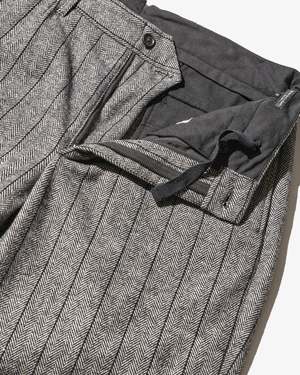 The Andover Pant is the simplest and most basic design in Engineered Garments pants lineup. This classic style follows the look of dress trousers and features a relaxed waist and tapered silhouette with a cuffed hem. The striped herringbone fabric adds an elegant and chic touch to this popular trouser. - 20% wool 25% poly 45% acrylic 10% other Made in USA.