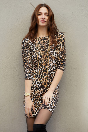 Slinky leopard spots recharge a slim-fitting sweater-dress spun from an exquisitely soft blend of silk and cashmere. Dry Clean. Imported. Model is Wearing Size XS.