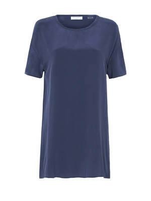 Equipment's Riley Oversized Tee is a classic tee shirt silhouette with a shirt tail hem, a round neck and exaggerated side splits. This silk style is short sleeved and is a beautiful inky blue colour. ---- FABRIC OR COMPOSITION 100% Silk SIZE AND FIT The EQUIPMENT RILEY OVERSIZED TEE in PEACOAT is true to size Measurements taken from a Size S Sleeve Length: 6.7in / 17cm Back Length: 31.1in / 79cm Neck Drop 3.2in/ 8cm Model wears a Size S, Kate is 177cm / 5'9" Bust 86cm / 34 inch, Waist 62cm/ 24.5 inch, Hips 89cm / 35 inch