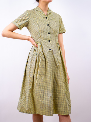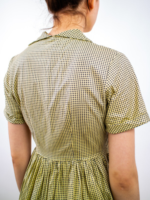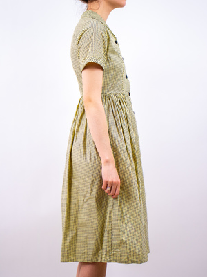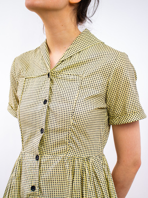 product details: split collar in the back! era: 40s fabric content: cotton colour: black + yellow condition: good measurements: shoulder - shoulder: 15" sleeve length: 8" chest (around): 36" waist (around): 29" hip (around): 64" length: 42" models measurements: shoulder - shoulder: 17" bust: 33" waist: 25" hip: 37" height: 5'10"
