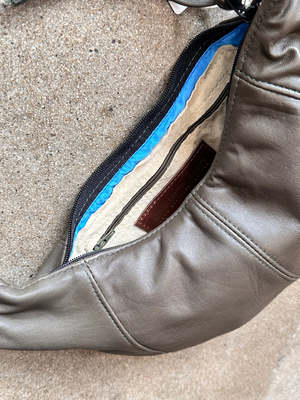 This recycled leather sling bag by Erin Templeton features an easy adjustable strap design, allowing you to change the length or swap it for a silk scarf or chain strap for a personalized look. Each Erin Templeton recycled piece is crafted from upcycled garments, so the leather and construction may vary from regular leather bags. Product details: - Leather sling style bag, worn over the shoulder or across the body - Fully lined with cotton blend interior - Interior 6x8" leather pocket with zip closure - Adjustable knotted strap (0.75" width) - Zip closure - Dimensions: 7" tall x 13.5" wide