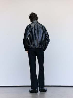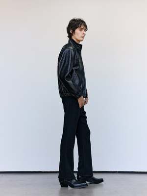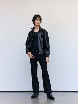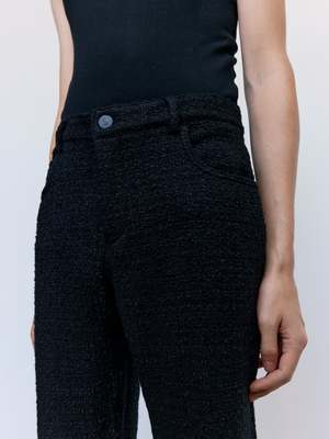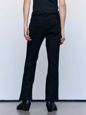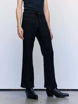 Medium weight wool boucle trousers in a five-pocket flared style. Wool boucle blend. Jonah is 6' and wearing a Size M.