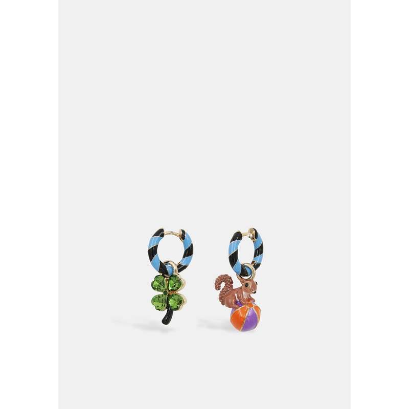 Small striped hoop earrings featuring a sparkling green four-leaf glass clover on one earring and a tiny squirrel perched on a colorful circus ball on the other. Both hang from striped enamel hoops. - For pierced ears - Glass rhinestones - Gold-tone hardware - Light blue/Dark green - Type: Earrings