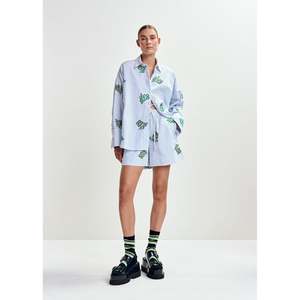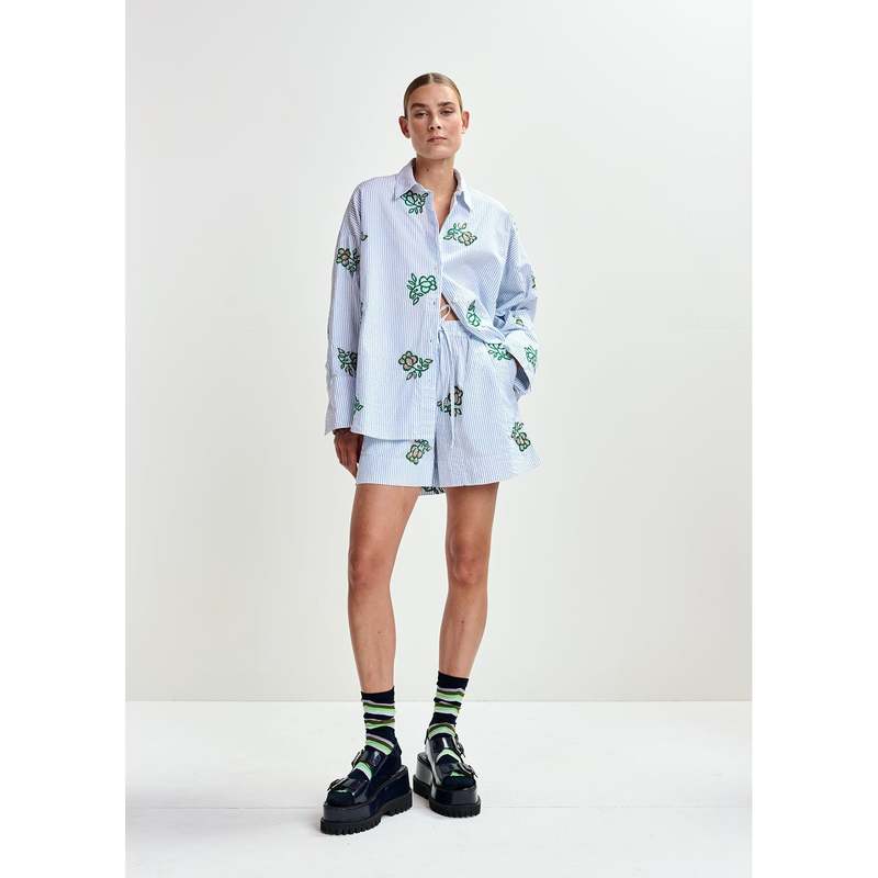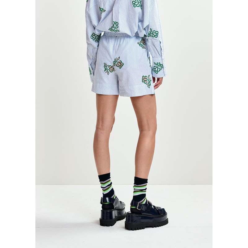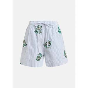 Pinstripe shorts are beautifully accented with delicate embroidered details with sequin and bead embellishments. Crafted from 100% cotton, they feature a high-rise design and a relaxed fit, complete with an elasticated waistband and drawstring fastening for all-day comfort. Inverted pleat details at the waist add subtle structure, while slanted pockets bring a touch of practicality. Perfect for effortlessly stylish, casual looks. - 100% cotton - Light-weight, non-stretchy fabric - Designed for a relaxed fit - High rise - Elasticated waistband with drawstring fastening - Inverted pleat details at the waist - Slanted pockets - Embroidered details with sequin and bead embellishments