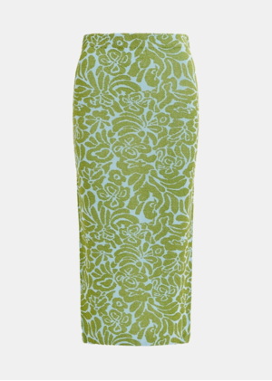Midi skirt is designed for a close, figure-flattering fit, featuring an elasticated waistband for all-day comfort and ease. Jacquard floral detail. - Contains recycled polyester - Mid-weight knit - Designed for a close fit - Elasticated waistband - Light Green Fabric - 49% viscose - 30% polyester - 13% polyamide - 8% metallic Washing instructions - Handwash Model information - The model is 5'9" tall and is wearing a size S. Product measurements - SIZE S - Length: 30" - Waist: 28"
