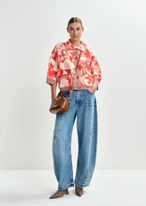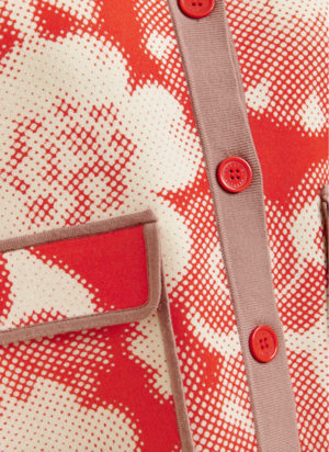 Adorned with a subtle, eye-catching floral pattern reminiscent of psychedelic blooms, this cardigan is crafted from a fine knit for lightweight comfort. Designed for a relaxed fit, it features a button fastening and bold contrast trim for a playful touch. Finished with flap pockets and cropped 3/4 sleeves. Easy to layer, effortless to wear. - Contains recycled polyester - Fine knit - Designed for a relaxed fit - Button fastening - Flap pockets - 3/4 sleeves - Dropped shoulders - Contrasting trims - Red/Off-white/Brown Fabric: 46% Viscose, 28% Polyester, 21% Polyester - Recycled, 5% Polyamide Piping: 62% Viscose, 38% Polyester Handwash Made in China Measurements: Product measurements (Size S) Length: 23" Model is 5'9" and is wearing a size Small.