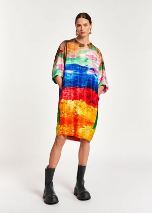 Colorful mini dress is printed with paintbrush-like strokes and has a loose balloon-shaped silhouette. The classic round neckline and sleek inverted seam keep the design smart and elegant. - 3/4 sleeves - Slit pockets - Lined - Dropped shoulders - Balloon-shaped fit - Orange/Blue/Brown