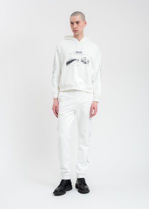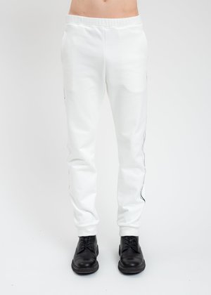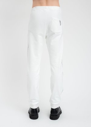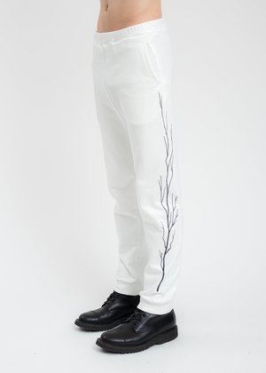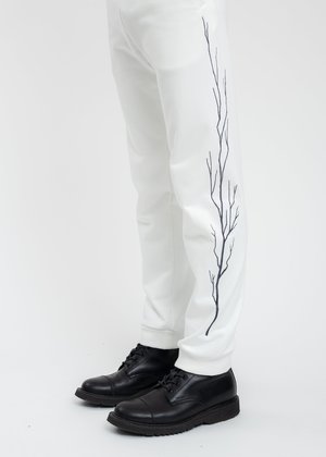 Slim fit white sweatpants. Features black branch graphic prints along the outer seams of either leg. Elasticized waistband and cuffs. Tonal stitching. Slim Fit 100% Cotton Imported Model is wearing size M Model is 6' (183 cm), 140 pounds (68 kg), usually wears M in tops. A size 30 in denim and 48 in trousers. Size 10 in shoes