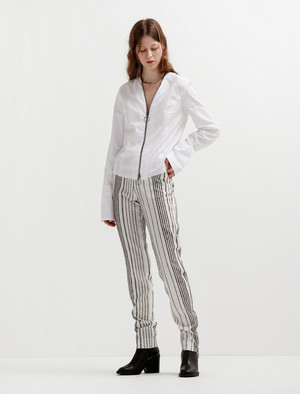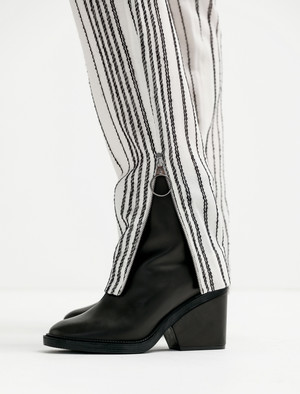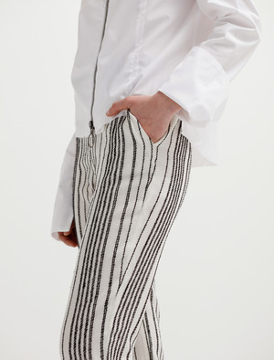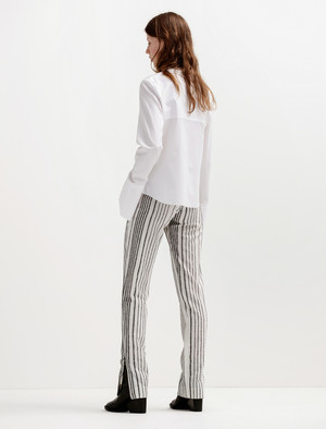 A a long, slim-cut pant in a soft wool blend striped jacquard by Mauro, a leading fabric manufacturer of Italy. Silver tone o-ring zipper detailing runs vertically up each hem which can be worn closed or open for styling preference, as well as at the fly, which has a moderate rise. Features slash pockets at each side and double welt mock pockets at the back. - Made in the EU - 83% virgin wool, 12% merino wool, 5% polyamide - Partially lined - Dry clean - Model is 5'10"; bust 31"; waist 23.5"; hips 34"; wears a size 36