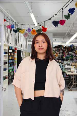 Short-sleeved boxy shirt. Right chest patch pocket and buttonhole at the front. Available in two colors: natural/black and natural/lilac. Print developed by Eve Gravel. Made in Montreal Canada | Buy local Composition and Maintenance: 70% COTTON 30% LINEN OEKO-TEX CERTIFIED FILLINGS NOT INCLUDED MACHINE WASH DELICATE COLD WATER CYCLE WITH SIMILAR COLORS HANG TO DRY IRON REVERSE AT LOW TEMPERATURE Aleyssa wears size XL Interview TRIMS NOT INCLUDED MACHINE WASH GENTLE CYCLE COLD WATER WITH SIMILAR COLORS HANG TO DRY IRON REVERSE WAY AT LOW TEMPERATURE Size Aleyssa wears size XL Composition 70% COTTON 30% LINEN OEKO-TEX CERTIFIED Description Short-sleeved boxy shirt. Right chest patch pocket and buttonhole at the front. Available in two colors: natural/black and natural/lilac. Print developed by Eve Gravel. Made in Montreal Canada | Buy local