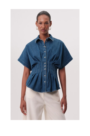 The Marisa Shirt is designed with a flattering cinched waist and a relaxed fit. The timeless blue denim pairs seamlessly with everything from white sneakers to black boots. Simple, stylish, and endlessly versatile, the Marisa is the shirt you'll reach for again and again. Color: Blue Denim color: Blue Style: Cinched waist blouse top.